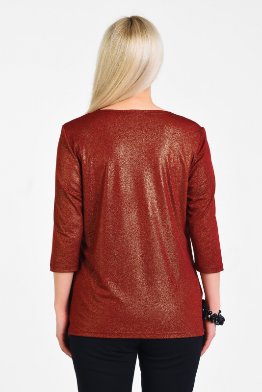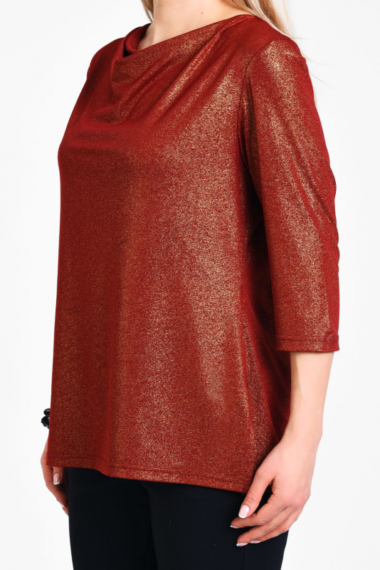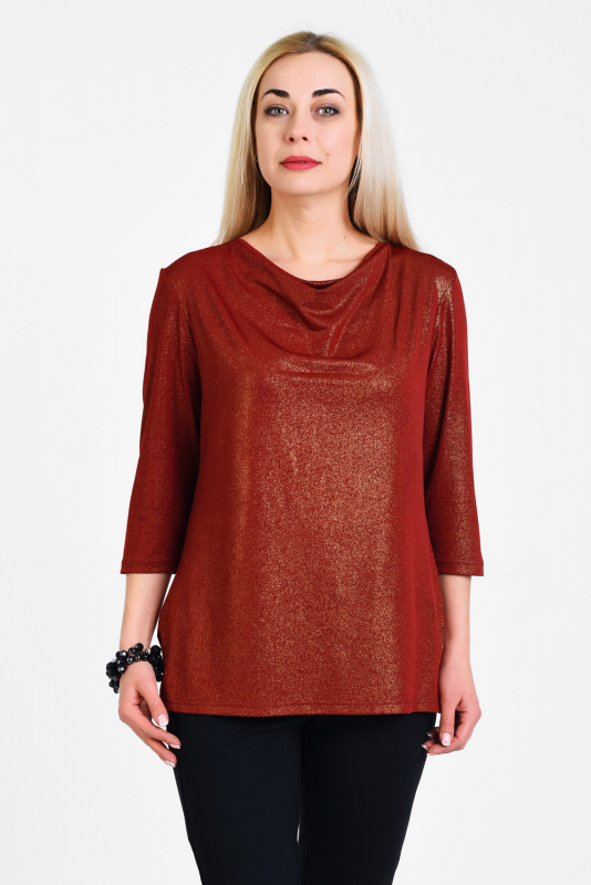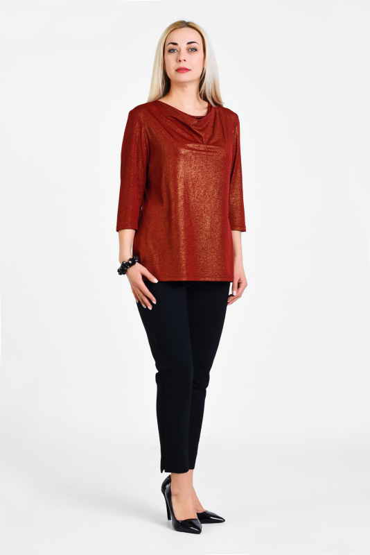 Нарядная блузка для торжественных и праздничных случаев из мерцающего трикотажа, узким рукавом 3/4, подчеркивающим линию запястья. Лаконичная элегантная модель визуально подтягивает фигуру, делает ее стройнее, воротник-каскад – единственная «игривая» деталь блузы, приоткрывает ключицы, подчеркивает линию шеи.
