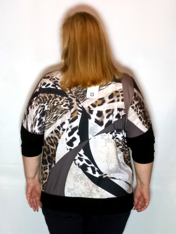 Рукав 3/4, спущенное плечо, нижняя часть из однотонного трикотажа.