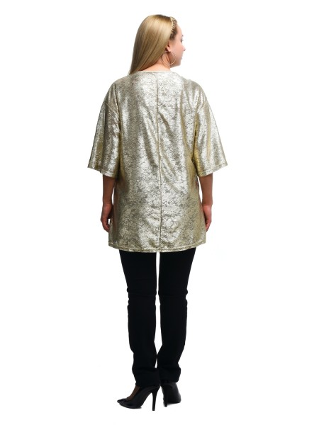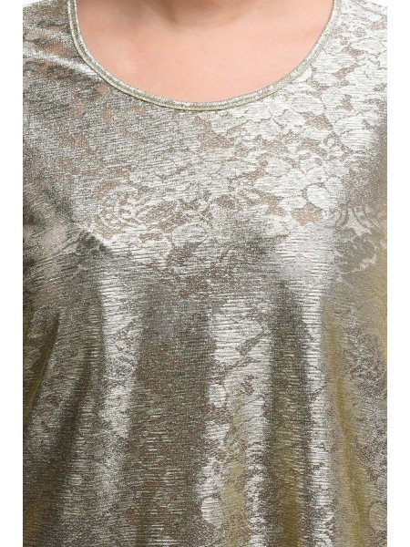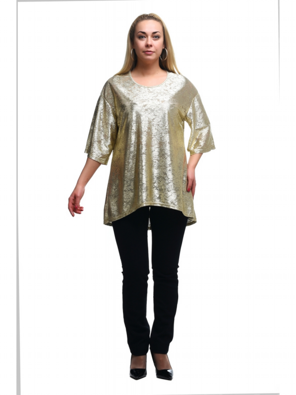 Изысканная нарядная туника из гипюра с блестящим напылением фойлом. Модель A -силуэта, с глубоким круглым вырезом горловины, подчеркивающим красоту шеи; широкими отрезными рукавами со спущенным плечом, длиной 3/4; низ лифа изделия выкроен аркой, визуально удлиняющей ноги. Мягкая драпировка спереди вуалирует несовершенства фигуры, придает легкость и плавность движениям. Туника – универсальный праздничный наряд, для тех, кто любит ловить взгляды, полные восхищения.
