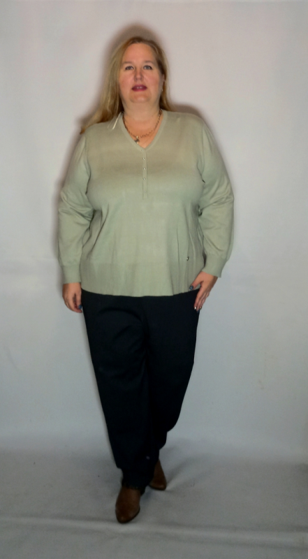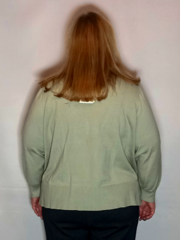 Вязаный оливковый джемпер свободного силуэта с V-образным вырезом. Втачной рукав. Эластичный широкий пояс и манжеты с более мелкой вязкой на растяжение. Модель выполнена из вискозы с добавлением модала, полиэстера. Планка декорирована исскуственным жемчугом.Отлично сочетается с классической прямой юбкой и брюками.