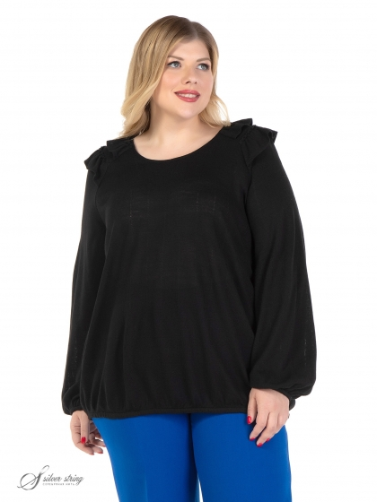 Нарядный джемпер прямого силуэта, в стиле Easy-chic, выполнен из фактурного однотонного трикотажного полотна. Модель с округлой линией горловины и длинным, объемным рукавом покроя реглан. Между линиями реглана полочки и спинки, параллельно вырезу горловины, настрочены два ряда рюш. Низ изделия и рукава обработан тонкой эластичной тесьмой. Удобный крой, и эффектный декор делают модель неповторимой.