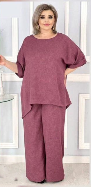 Элегантный, свободный, летний костюм выполнен из ткани сингапур. Ткань легкая, тонкая, но не рыхлая, с эффектом жатости, умеренно эластичная ( в составе есть небольшое содержание хлопка).