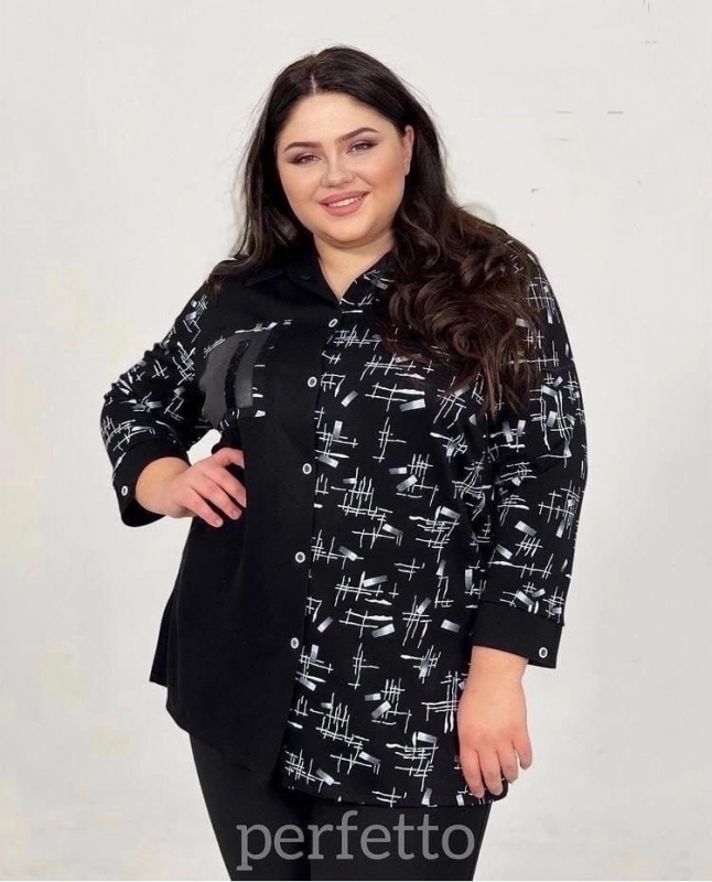 Шикарная  туника - рубашка выполнена из сочетания двух видов трикотажа: черный гладкий ( плотный, умерено эластичный) и с рисунком( чем то похож на ангору, но не пушистый, мягкий, эластичный, средней плотности).