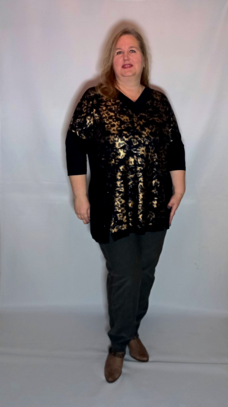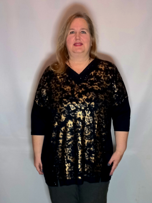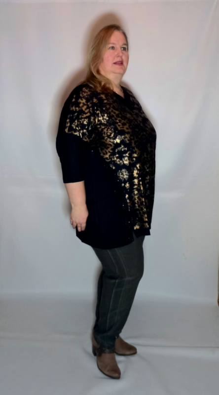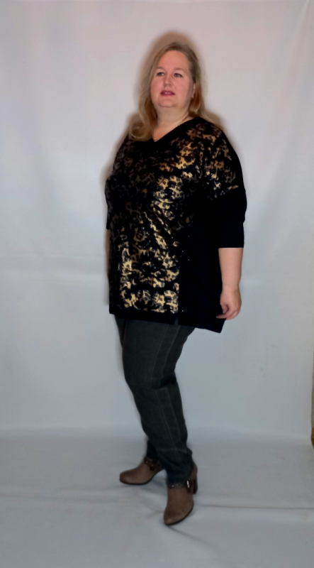 Полочка сложнокроенная: боковые вставки черного цвета, декорированы черными термостразами. Средняя часть полочки из принтованного трикотажа.
